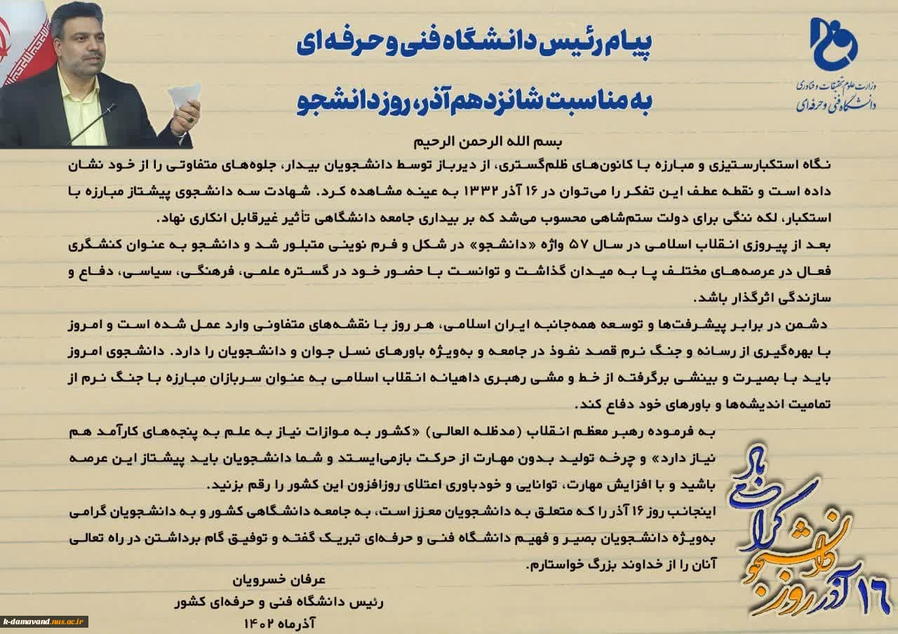 امتیاز دهید : پیام رئیس دانشگاه فنی و حرفهای به مناسبت شانزدهم آذر، روز دانشجو 2 جمعه 17 آذر 1402 ساعت 10:07
